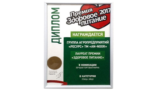 Еще одна награда Группы агропредприятий «Ресурс» в очередной раз подтвердила высокую оценку потребительских качеств продукции An-Noor™ и ее полное соответствие принципам здорового питания.