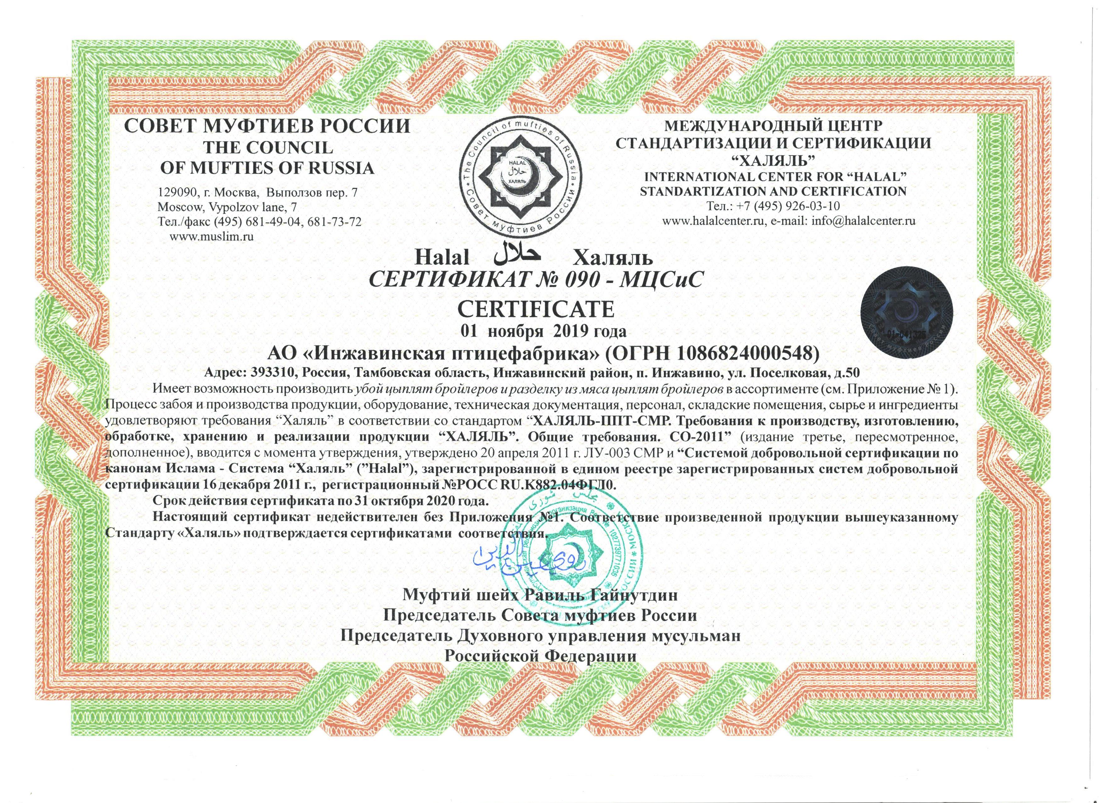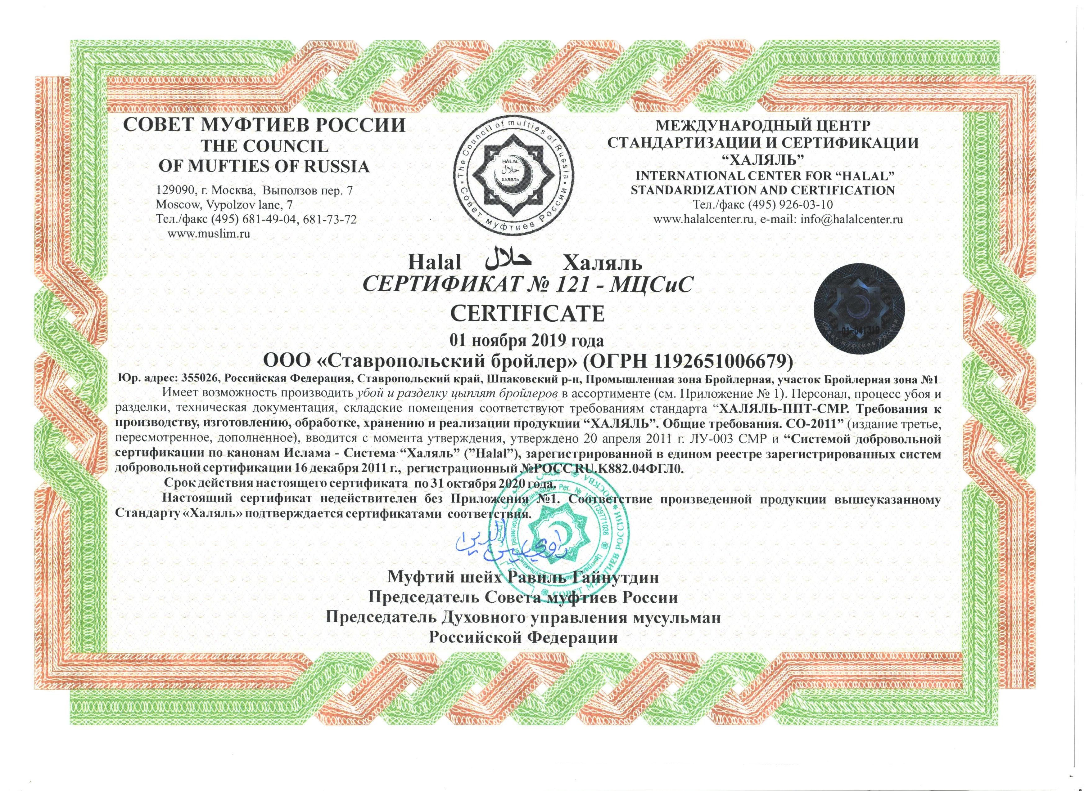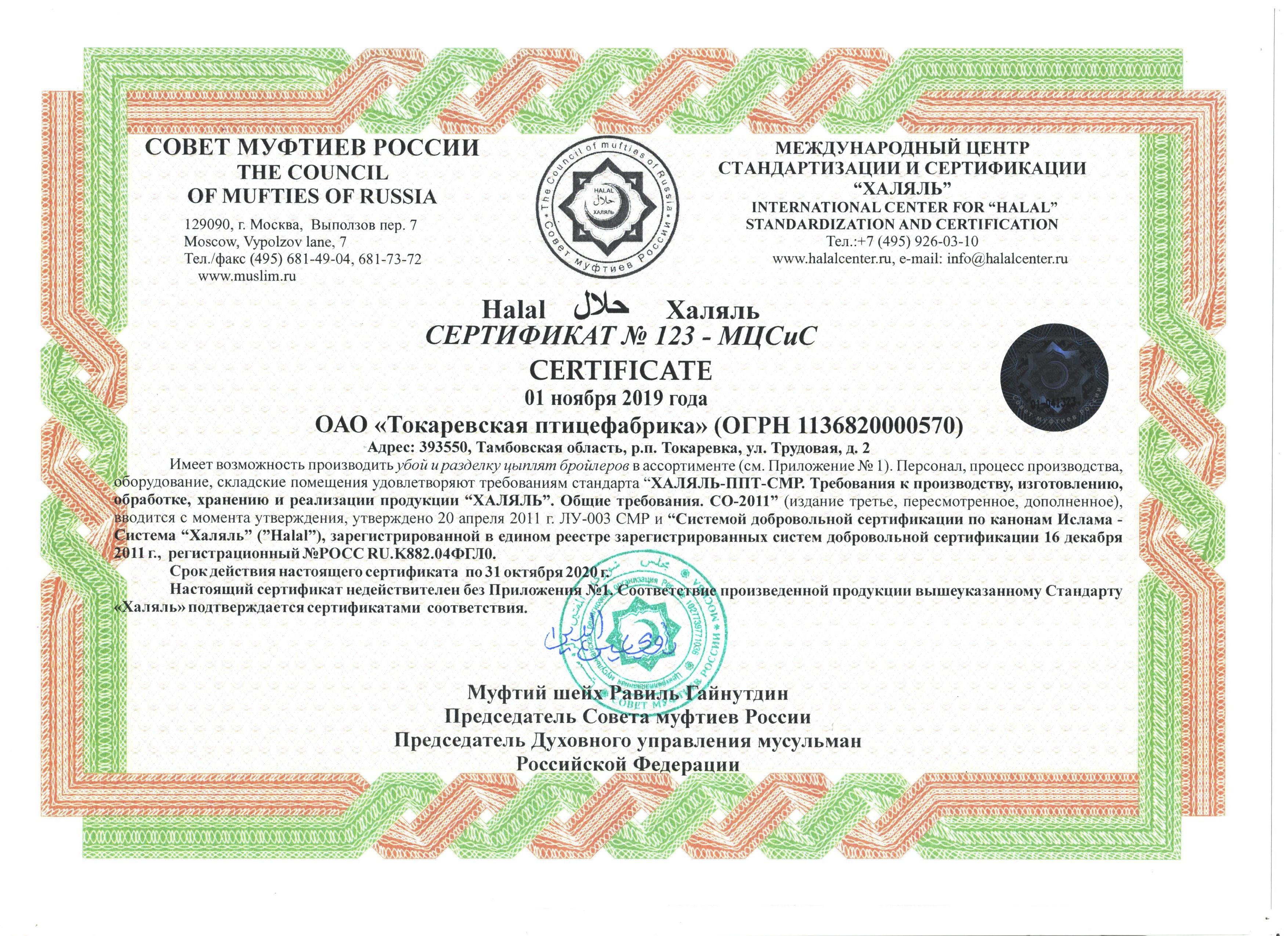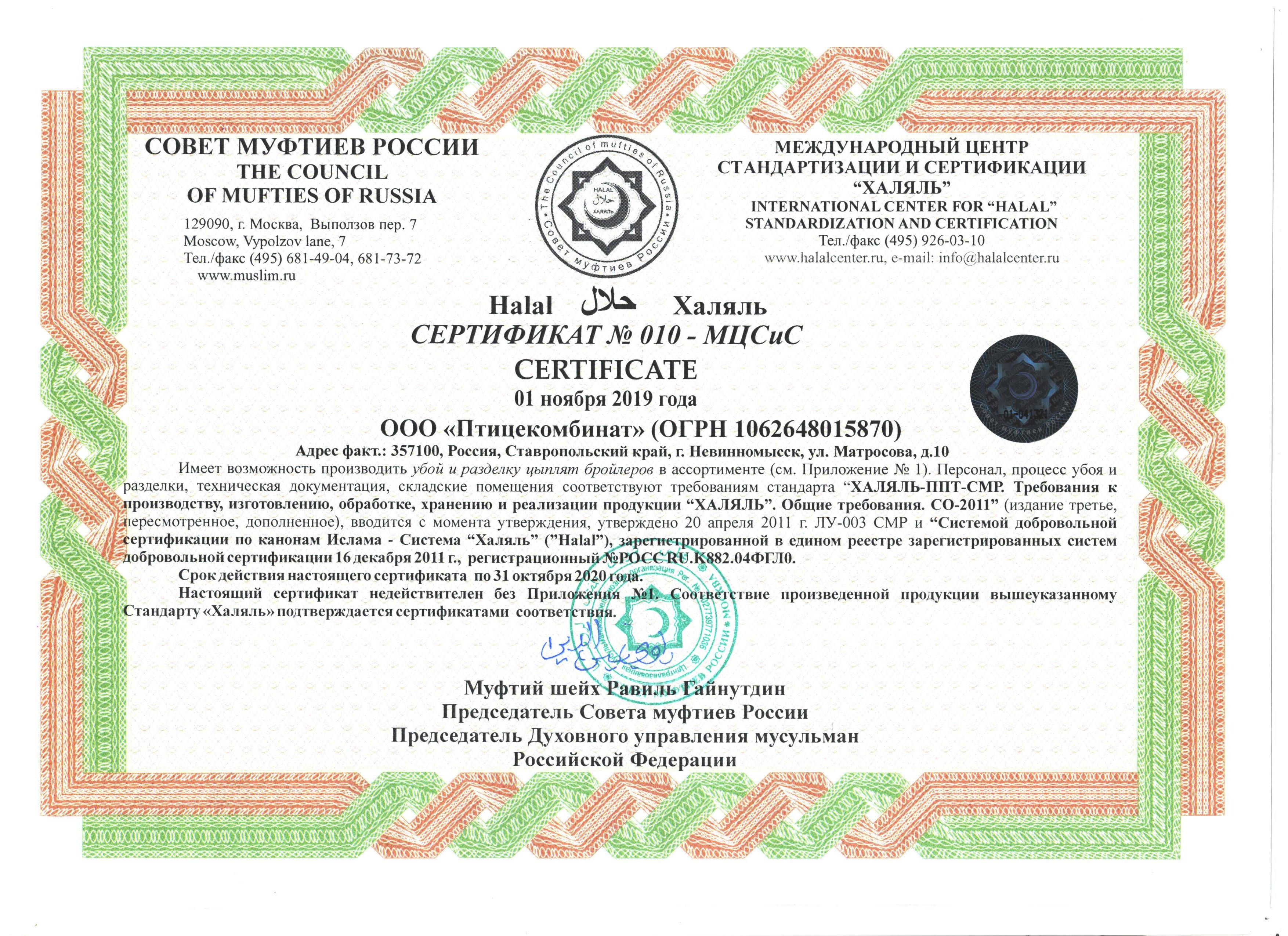Ежегодно наши перерабатывающие комбинаты проходят процедуру сертификации на соответствие требованиям стандарта «Халяль», которую осуществляют Международный Центр Стандартизации и Сертификации «Халяль» при Совете муфтиев России и Агентство по стандартизации и метрологии ОАЭ (ESMA).